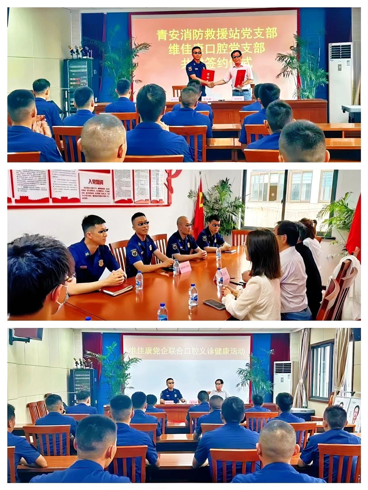 7月2日维佳康口腔党支部与青安消防救援站党支部召开党建共建签约仪式。此次共建活动将充分发挥双方的专业技术优势和党建特色,通过医疗服务进楼宇、医学和消防安全知识讲座等多种形式,进一步提升双方的党建水平和能力。